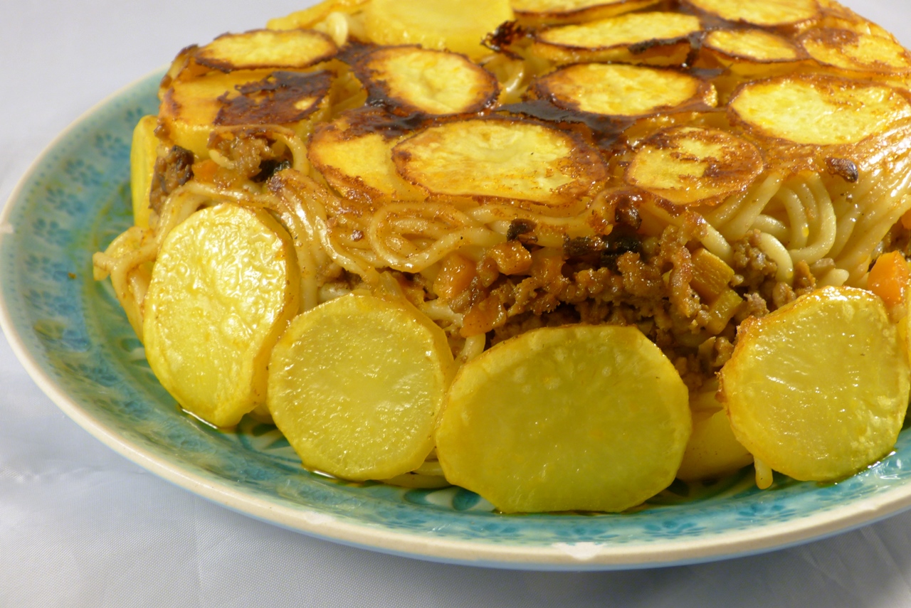 Für das Gericht werden Spaghetti gegart und es wird eine nach persischer Art aromatisierte Hackfleischsoße gekocht. Das Ganze wird dann abwechselnd in einen Topf geschichtet, dessen Boden zuvor mit Kartoffelscheiben ausgelegt wurde. Schließlich gart alles im eigenen Dampf, ganz wie bei dem klassischen Reis. Und das Ergebnis: Spaghettikuchen mit knuspriger Kartoffelkruste.