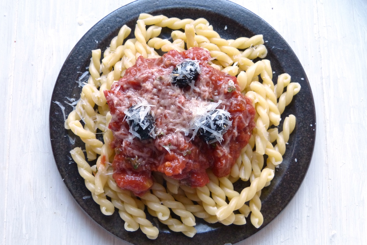 Nudeln auf Teller verteilen, die Tomatensauce darüber geben, Oliven und Parmesan darüber geben und servieren.