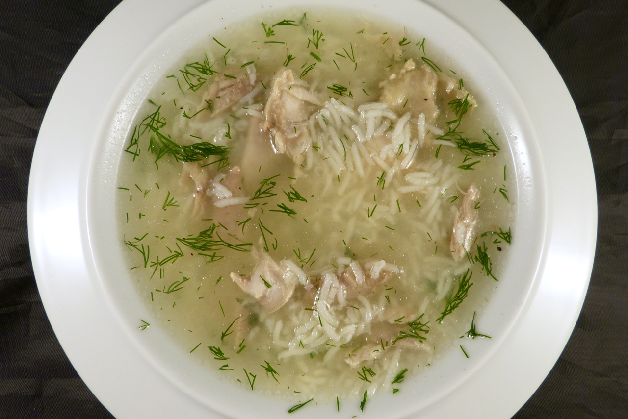 Fleisch und Dill zur Brühe mit dem Reis geben, alles mit Salz und reichlich frisch gemahlenem Pfeffer abschmecken und gleich servieren.