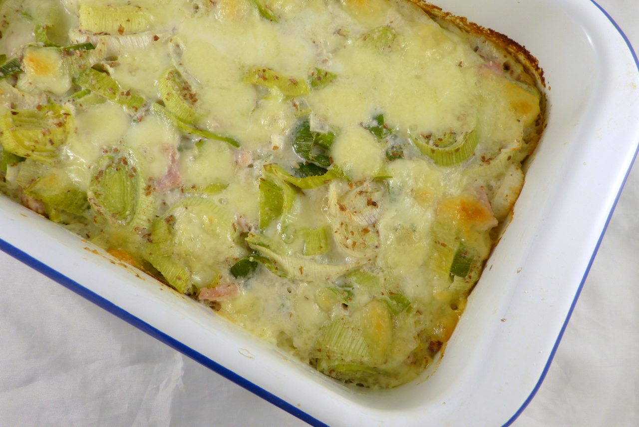 Die moderne französische Küche beschränkt dieses Prinzip aber nicht auf Süßspeisen – man kennt herzhafte Clafoutis, genau, wie man herzhafte Crumbles und herzhafte Rührkuchen kennt. Die Variante mit Lauch aus dem Ducasse* hat mich gleich angesprochen, und ich kann sie Euch wärmstens empfehlen: es ist ein einfach gemachtes Gericht, das nicht nur schmeckt, sondern es ist auch gleich alles drin, was man braucht: Gemüse, Käse, Schinken und Kohlehydrate. Vielleicht noch ein Salat dazu, und alles ist gut.