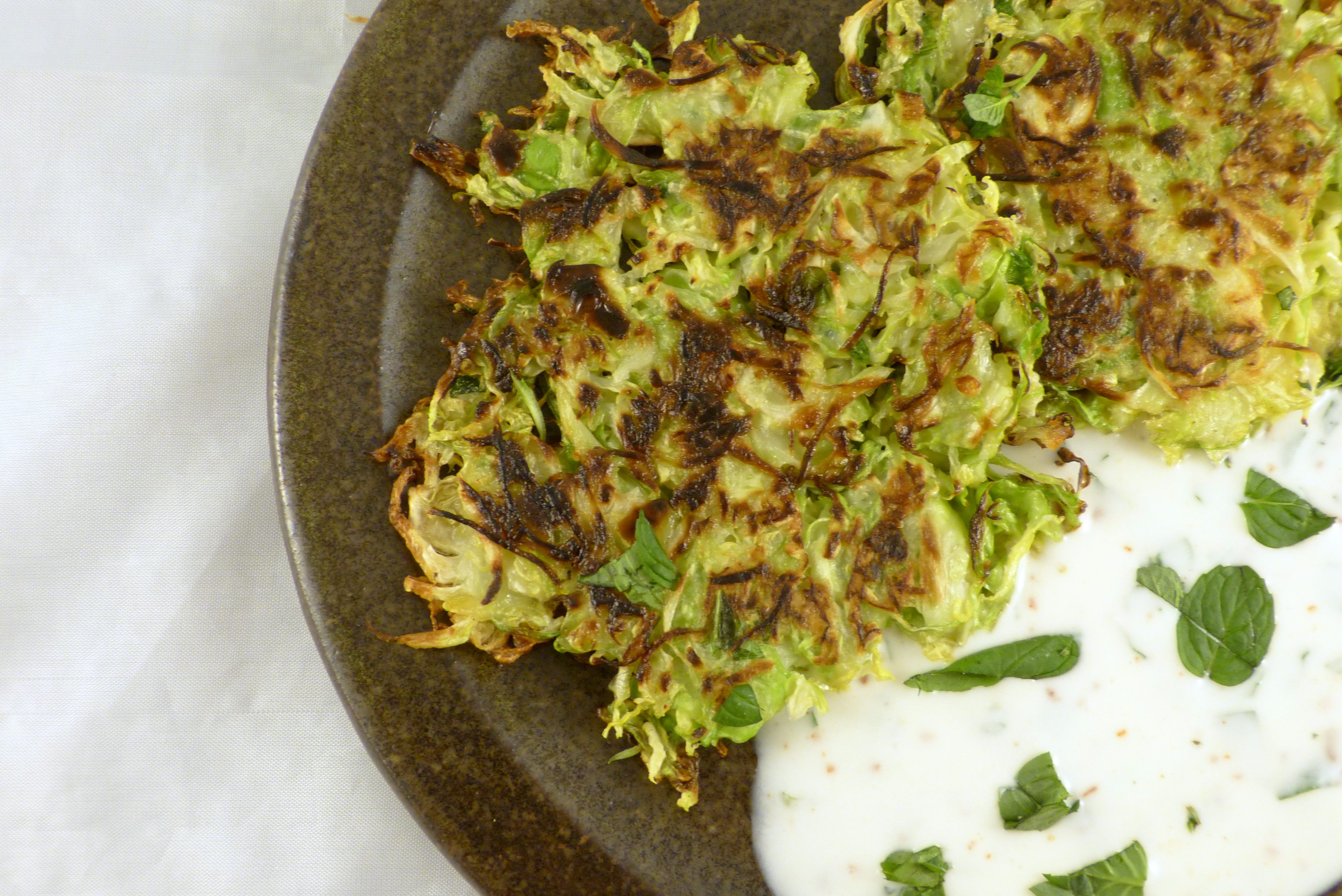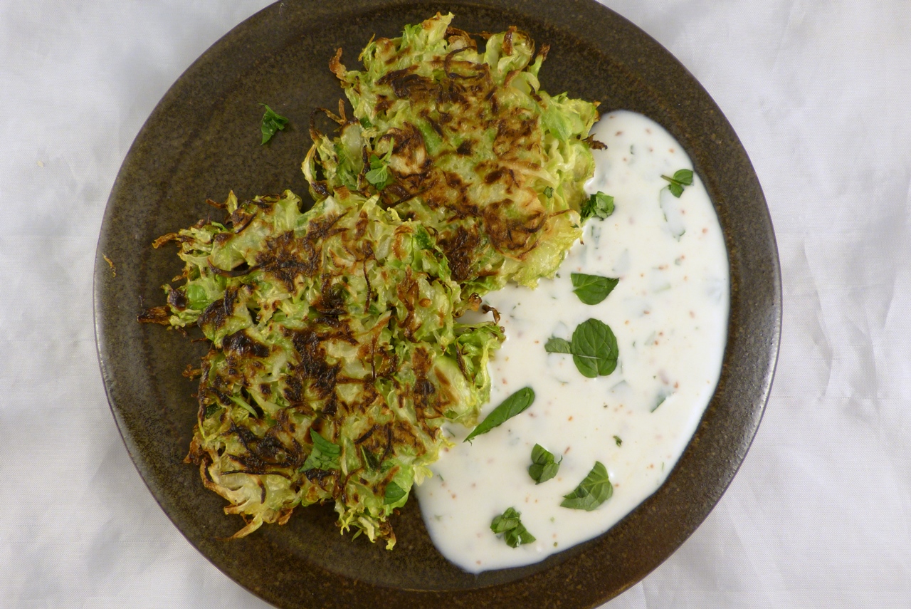 Oder Puffer. Diese Idee von great british food war mir neu. In Großbritannien hat Rosenkohl sowieso einen anderen Stellenwert; und glücklicherweise kommt man auch dort davon ab, ihn in reichlich Wasser zu weich zu garen ;-). Und die Puffer sind eine tolle Idee. Warum bin ich da nicht früher drauf gekommen? Die Puffer machen etwas völlig Neues aus dem Rosenkohl und sind richtig klasse. Also, so neu, dass sogar mein Sohn eine ordentliche Portion davon verputzt hat. Ich habe einen Joghurt-Dipp mit Minze dazu serviert: