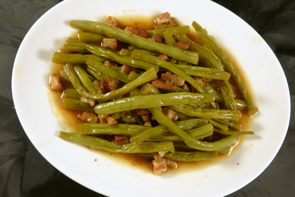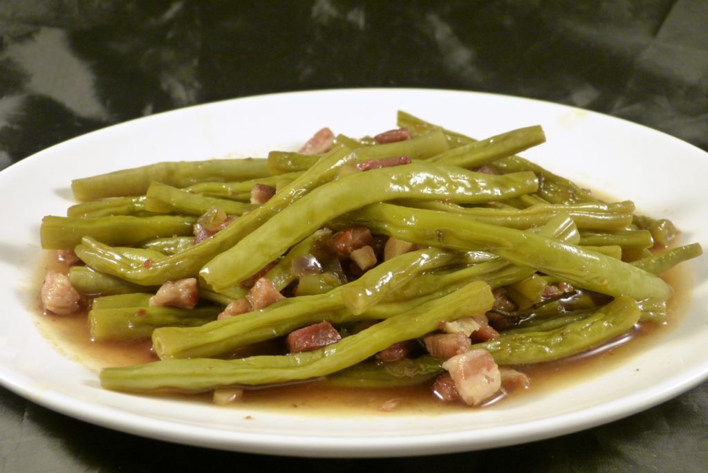 Aber Optik hin, Optik her – diese Bohnen sind der Hammer. Die werden hier sicherlich noch oft auf dem Tisch stehen. Durch die lange Garzeit verbinden sich die Aromen; die Bohnen selbst schmecken nussig und ein wenig süß. Und die Sauce aus Hühnerbrühe, Essig, etwas Süße, Chiliflocken und Speck ist schlecht genial. Meine Bohnen waren etwas früher fertig als die Hauptmahlzeit, zu der sie serviert werden sollten und ich habe sehr viel genascht.