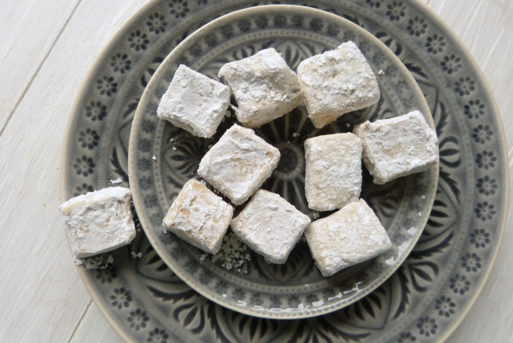 Marshmallows in Würfel schneiden – am besten mit einem leicht geölten Messer – und in der Puderzuckermischung wälzen.