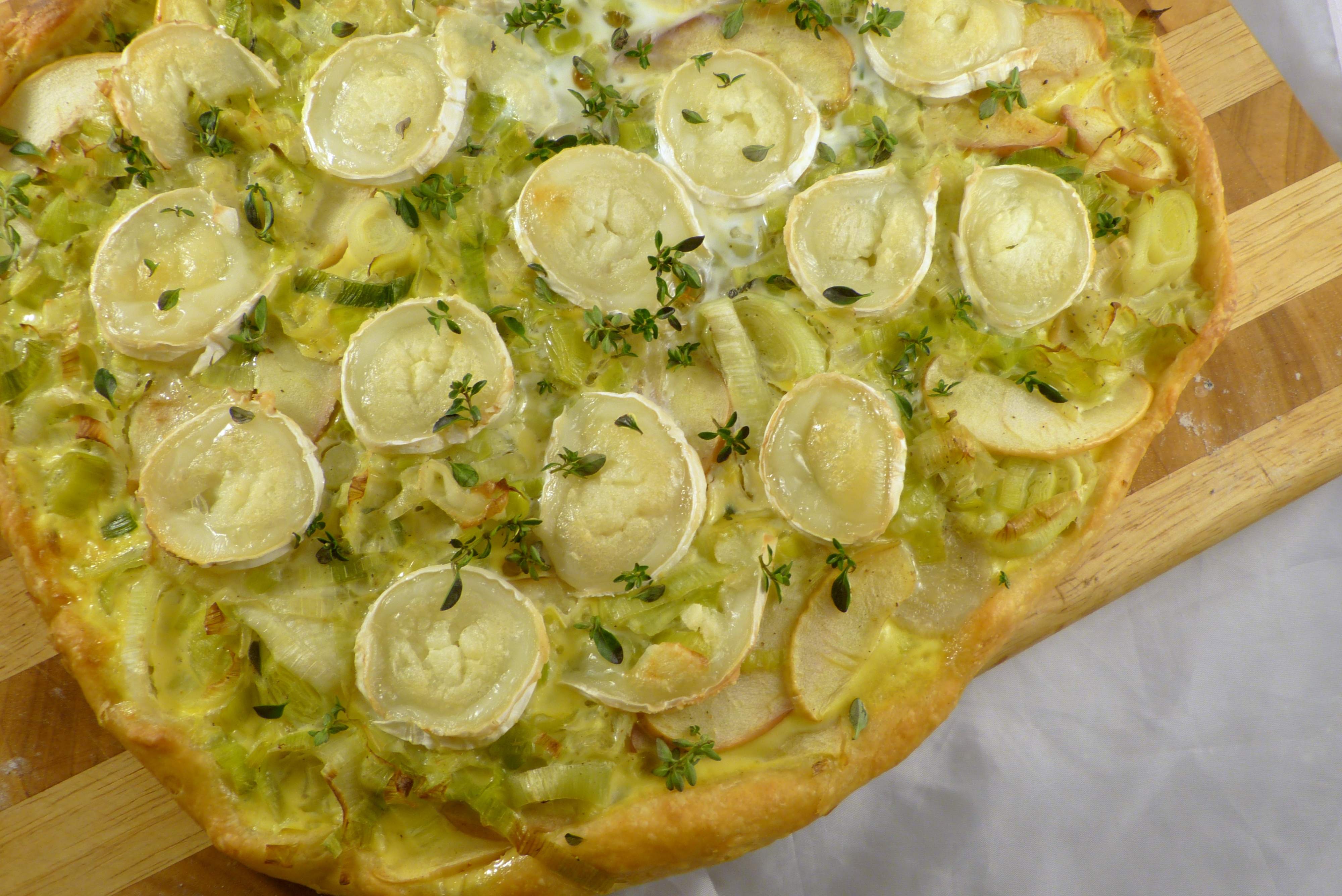 Für den Belag den Lauch putzen, in Ringe schneiden und dann gründlich waschen. Apfel vierteln, das Kerngehäuse entfernen und den Rest in dünne Spalten schneiden. Thymian zupfen, Käse in feine Scheiben schneiden.
