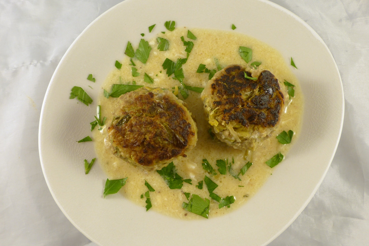 Lauch im Blitzhacker zerkleinern; er soll zerkleinert sein, aber kein Mus. Lauch zusammen mit Fleisch, Semmelbröseln und einem Ei in einer Schüssel vermengen und die Masse mit Salz und Pfeffer würzen. Alles zu ca. golfballgroßen Bällchen formen und diese etwas flachdrücken. Für 30 min kühl stellen.