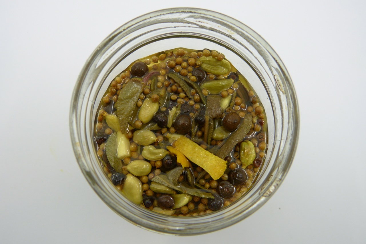 In den Apfelessig wandern verschiedene Kräuter und Gewürze. Man kann sich da kreativ austoben und einmal durch Gewürzschublade und Vorratskammer gehen. Das Elixier kann man außerdem in beliebiger Menge herstellen; ich habe probehalber erst mal weniger gemacht, aber ich werde bestimmt nachproduzieren.
