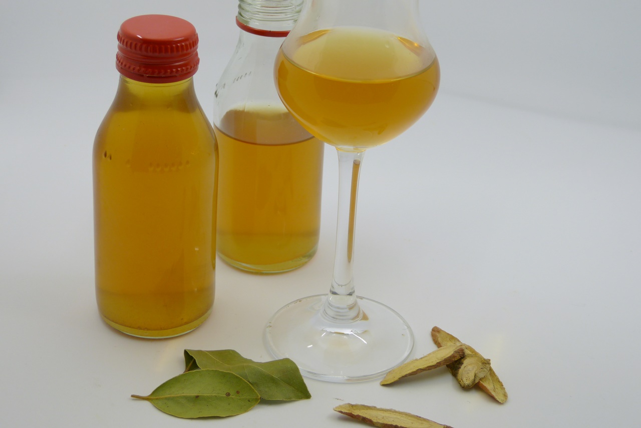 - 50 % Bestandteile mit bitterem Geschmack wie zum Beispiel Schalen von Zitrusfrüchten, Gänseblümchenwurzel, Süßholz, Kurkumawurzel oder Ingwer