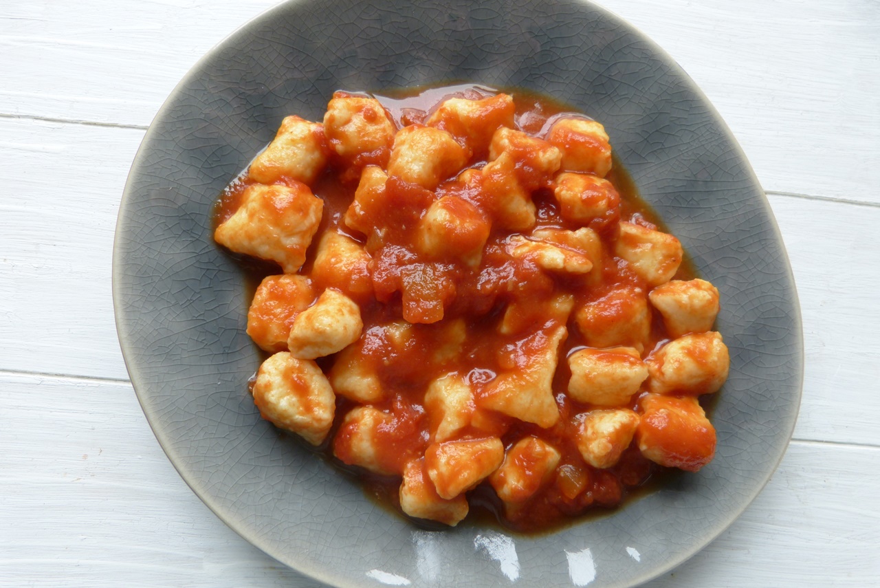 Genau die Sorge, es könnte sich alles in Wohlgefallen auflösen, hat mich bisher von Ricotta-Gnocchi abgehalten, das hat sich hiermit erledigt – die Gnocchi sind gelingsicher. Und waren bestimmt nicht zum letzten Mal unser Mittagessen. Dazu gibt es eine einfache Tomatensauce. Tomatensauce koche ich meist auf Vorrat und fülle sie heiß in sterilisierte Gläser. So ist eine Essenskomponente schon mal da, wenn die Zeit drängt. Ich mache die Sauce immer wieder mal anders – diesmal nach Claudio.