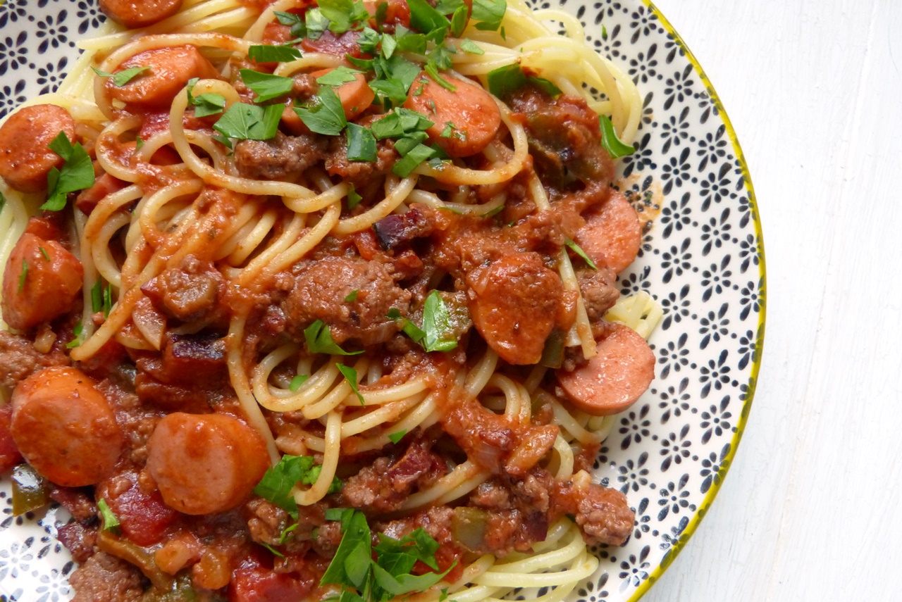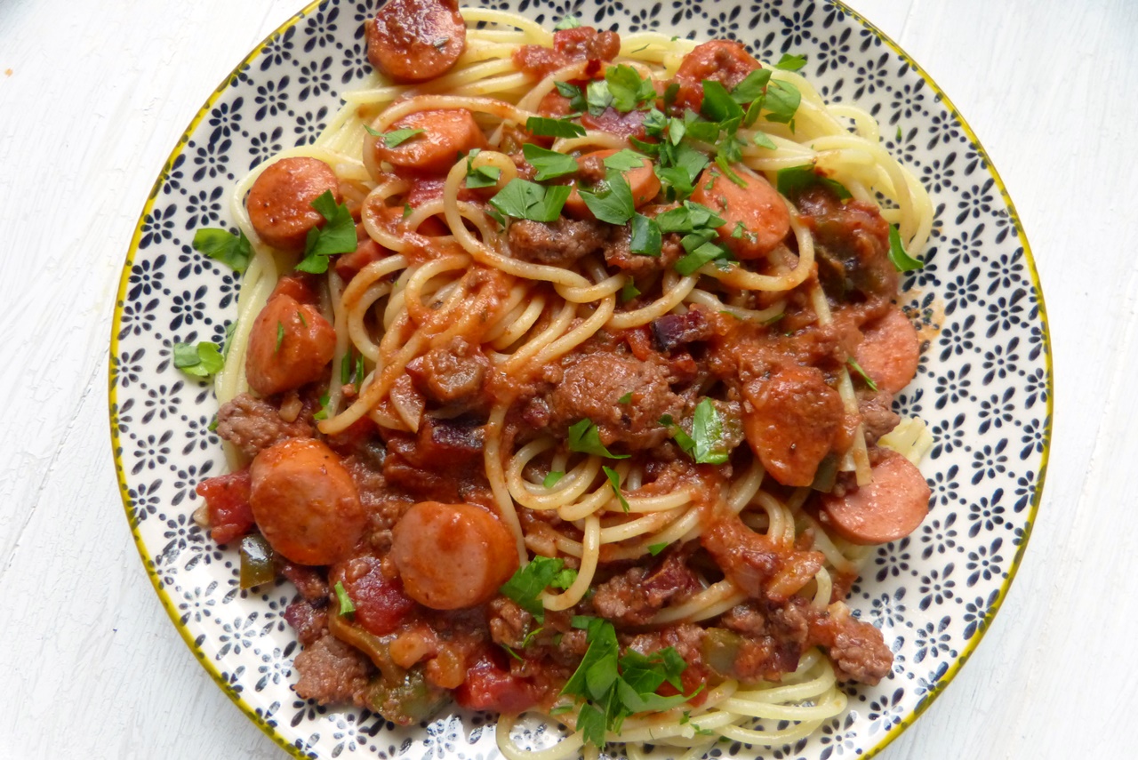 Ich sagte ja – man hat die klassische Hackfleischsoße an den Landesgeschmack angepasst, und ehrlich gesagt, das Rezept liest sich ein wenig seltsam. Tomatensauce mit Rinderhack, Speck, Wiener Würstchen und – Bananenketchup. Das klang so spannend, dass ich probieren musste, und ja, das Ketchup bringt eine leichte Süße mit, die sehr gut passt. Und abgesehen davon bekommt Ihr ein weiteres Rezept für die Verwertung überreifer Bananen.