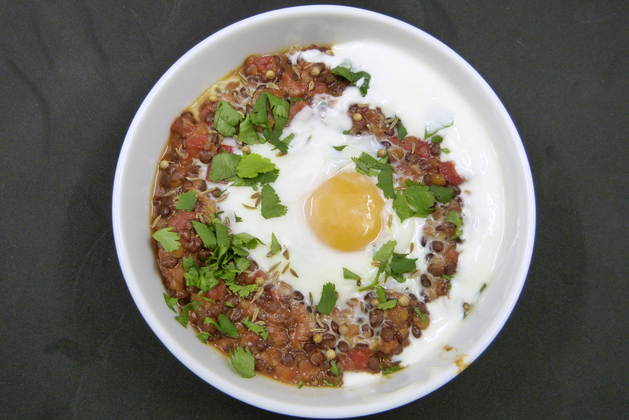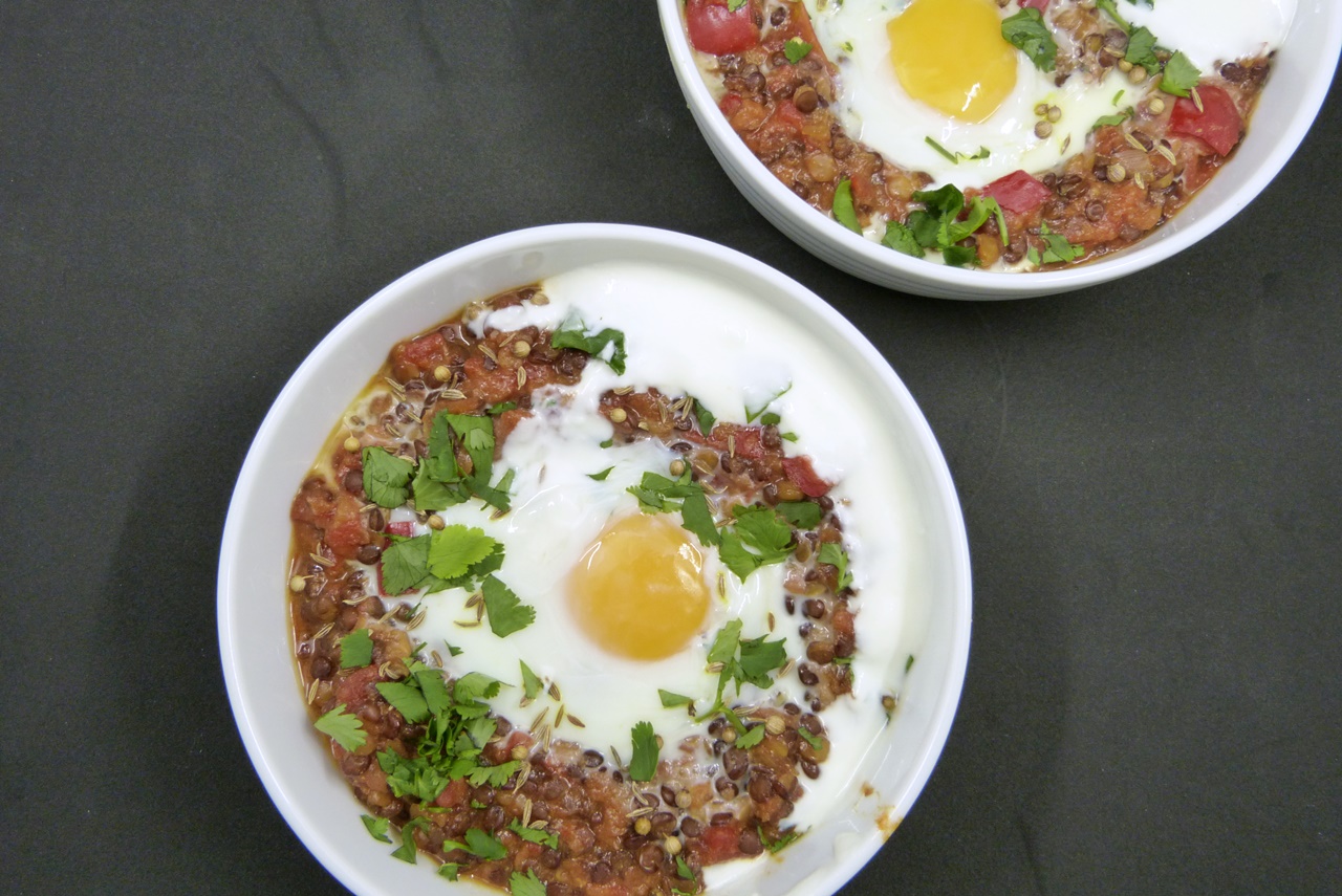 Ofen auf 180°C Ober- und Unterhitze vorheizen. Linsenmasse in eine Auflaufform von ca. 30 cm Durchmesser geben. Mit dem Löffel 4 Mulden in die Linsenmasse machen und ein Ei in jede Mulde aufschlagen. Mit einer Gabel einmal um jedes Eiweiß fahren; es vermengt sich dann besser mit den Linsen und verläuft beim Backen nicht so. Form abdecken und alles 10 bis 12 min backen.
