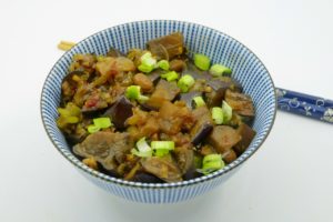 Sieht nicht so schön aus, schmeckt aber wunderbar – das Auberginen-Stir-Fry mit seiner Sauce aus fermentierter Chilipaste, Reiswein, Reisessig und einem Hauch Zucker.