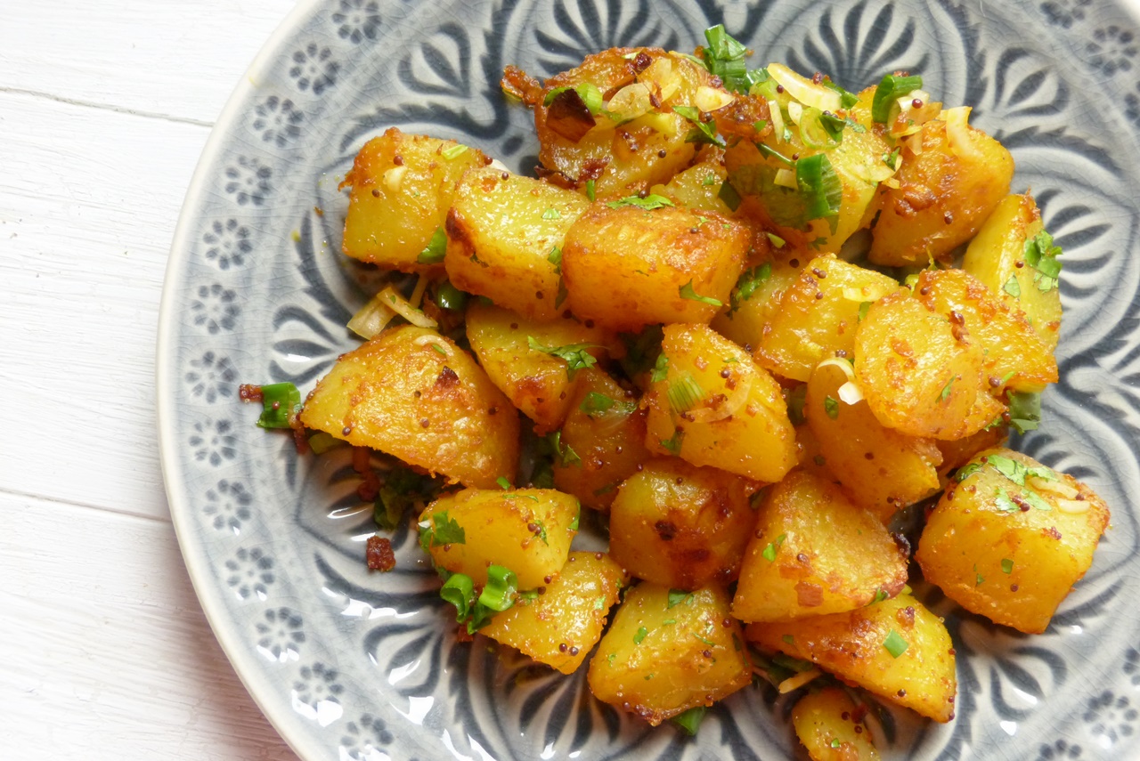Es entspricht nicht so ganz den Gepflogenheiten, man isst dazu eigentlich Brot; ich habe aber neben Brot noch Bombay-Kartoffeln dazu serviert. Dafür werden vorher angegarte Kartoffelwürfel mit Currypaste, Ghee und einigen Gewürzen im Ofen knusprig gegart. Mehr muss ich vermutlich nicht sagen, oder?