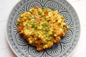 Angefangen habe ich mit zwei indisch inspirierten Gerichten: ich liebe ja Paneer und bereite diesen auch gerne zu wie Rührei. Klar, dass ich chenna burji ausprobieren musste, das ist indisch gewürztes Rührei mit Chenna, also weichem Paneer, Tomaten und Eiern. Fix gemacht – wenn der Frischkäse mal fertig ist – und schön aromatisch.