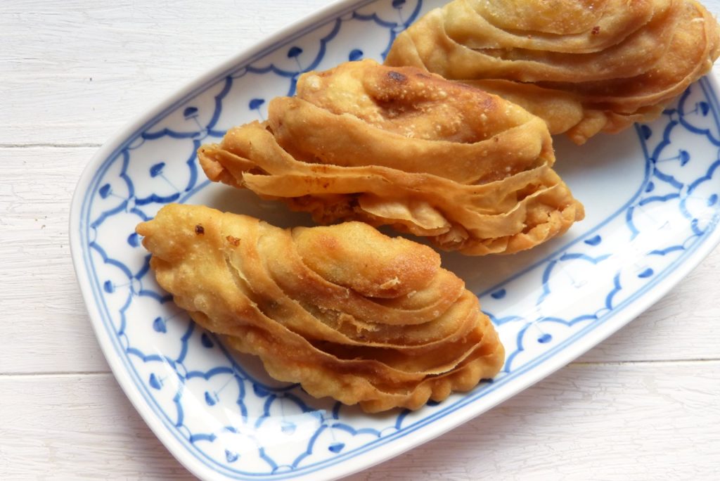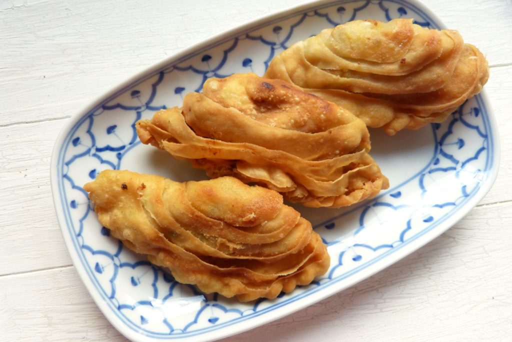 Curry Puffs ist ein Snack, der in Singapur, aber auch in Malaysia und Thailand weit verbreitet ist. Die Teigtaschen sind mit einem dickflüssigen Ragout aus Hühnchenfleisch und Kartoffeln gefüllt, das mit ordentlich Curry gewürzt ist. Der Clou ist die Teighülle (und auch das, was richtig Arbeit macht…): sie besteht aus zwei verschiedenen Teigen, die aufeinandergelegt und zusammen verarbeitet werden; die Mischung der Teige bewirkt das spektakuläre Aufblättern der Teighülle beim Garen.