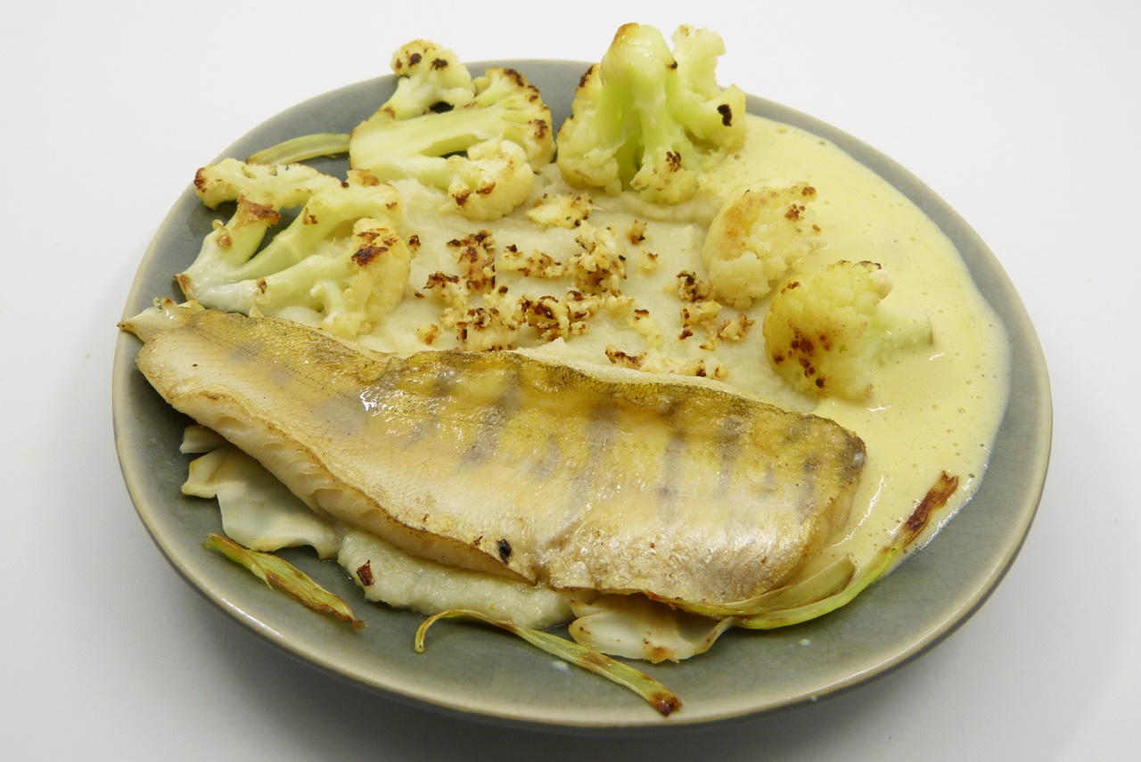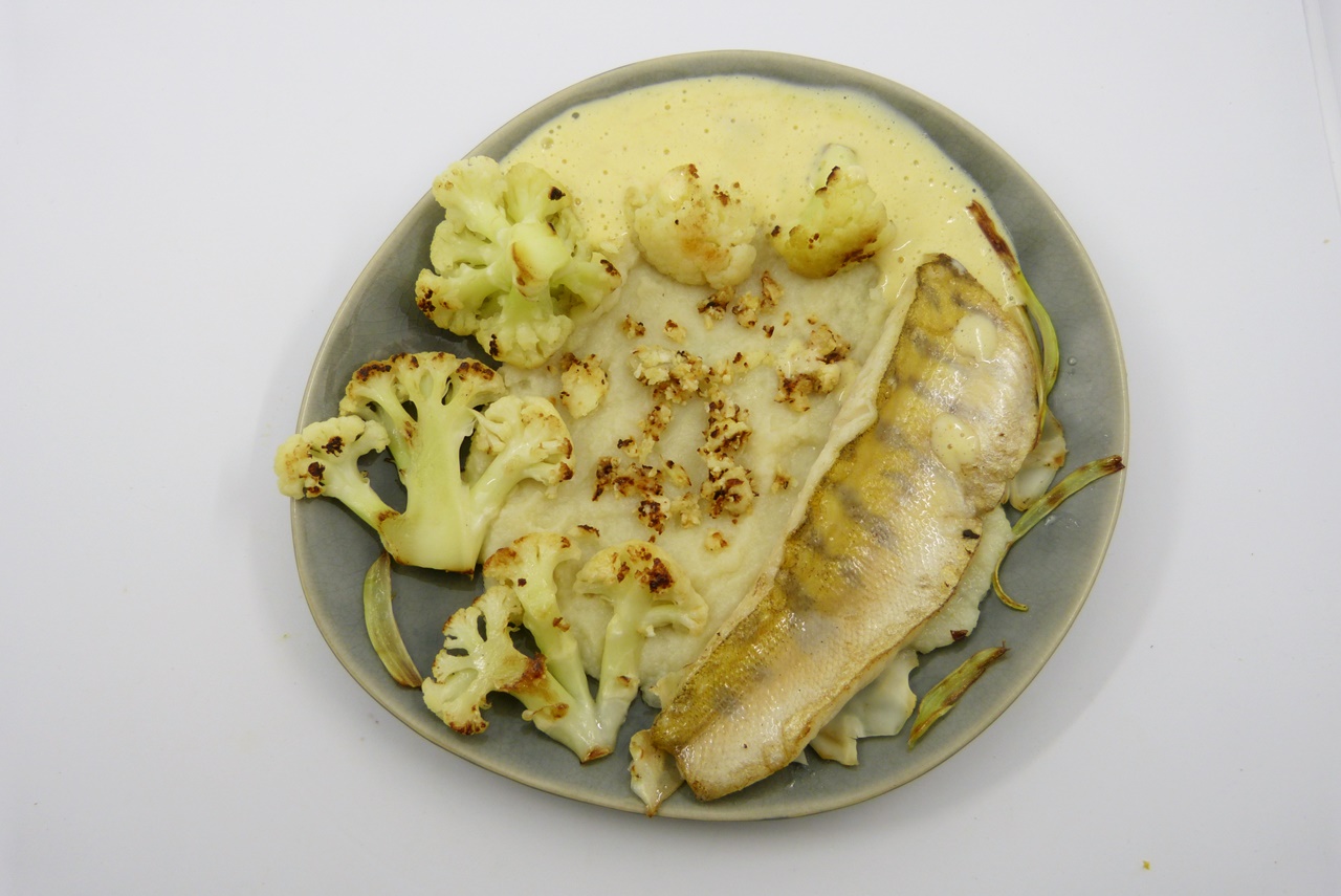 Das Blumenkohlpürée auf Teller verstreichen. Blumenkohlröschen, -Scheiben und Stielstreifen dazu anrichten. Püree mit etwas Blumenkohlcouscous bestreuen. Die Strunkscheiben vor das Pürée geben und den Fisch darauf platzieren. Sauce angießen. Original wird noch mit Seeportulak und Schnittlauch garniert.
