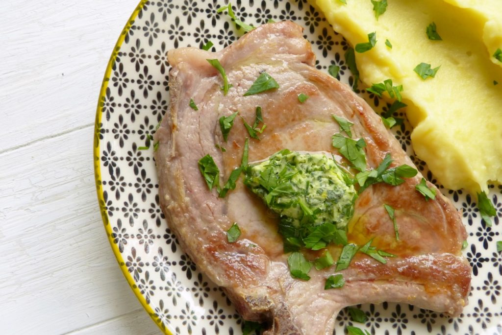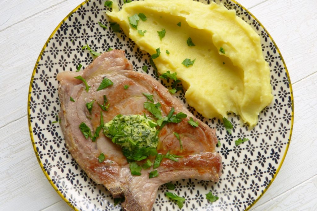 Zum Servieren die Koteletts auf Teller geben. Auf jedes Kotelett etwas von der Kräuterbutter geben und das Kartoffelpüree dazu anrichten.