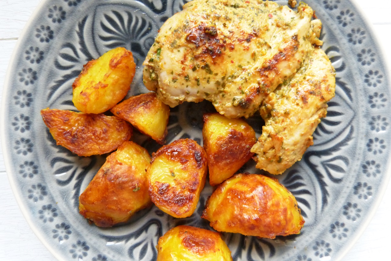 Zum Start habe ich mir 2 Gerichte aus unterschiedlichen Kapiteln herausgesucht, die aber gut zueinander passen: die in Joghurt, Harissa und Koriandergrün marinierte und dann gebratene Hähnchenbrust kommt aus der Sparte „leichte Festessen“ und die gerösteten Safrankartoffeln für besondere Anlässe passen hervorragend dazu.