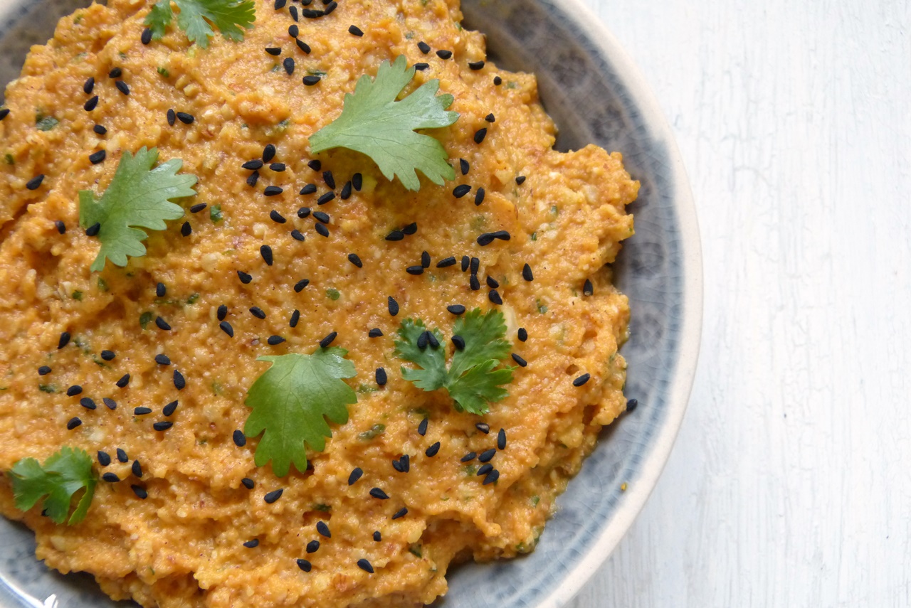 In meiner Abokiste sind regelmäßig Karotten; also – immer. Nicht immer bekomme ich die auch verarbeitet und freue mich also über neue Ideen. Dieser Dipp hier aus Karotten und Walnüssen, gewürzt mit Ingwer, Koriandergrün und Orange, ist so eine Idee. Das Ganze geht nicht nur als Dipp, sondern macht sich auch gut als Brotaufstrich, finde ich.