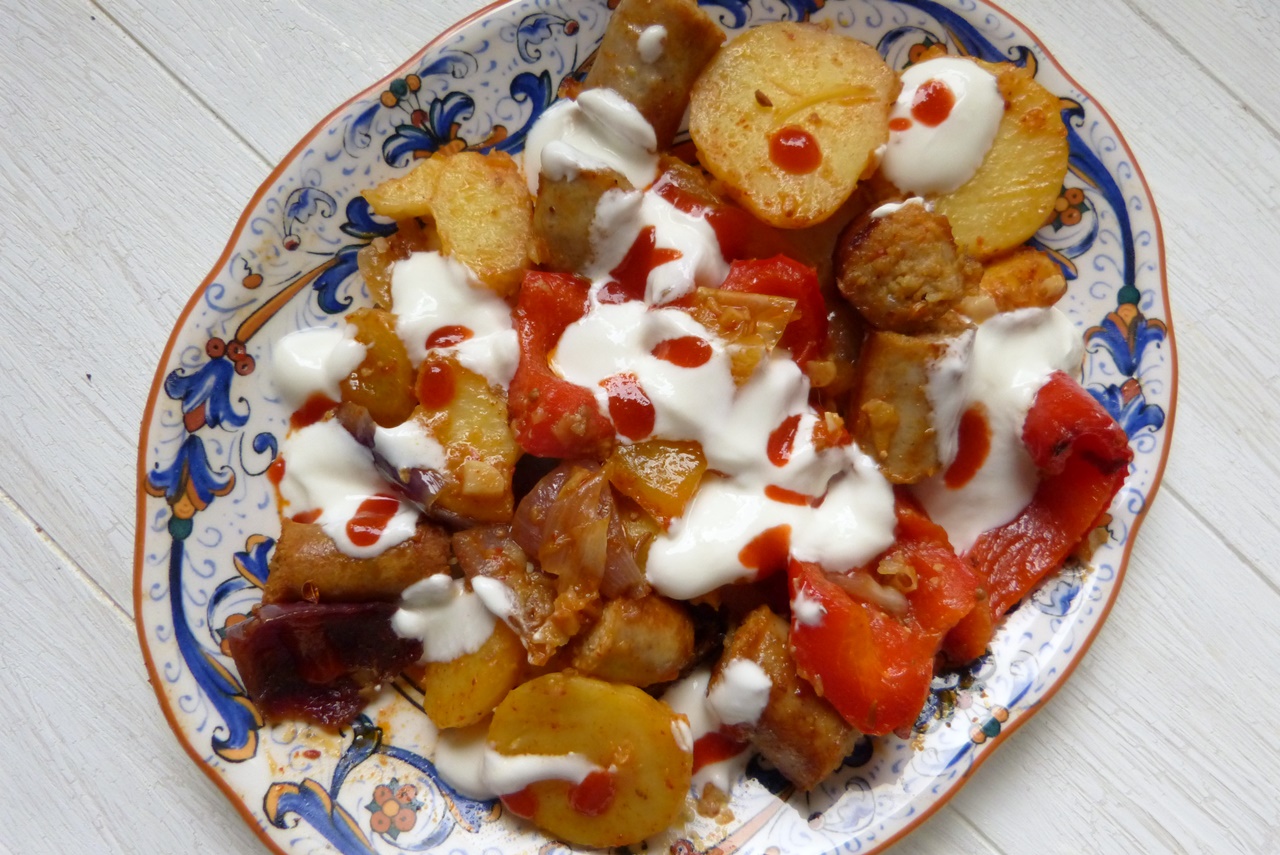 Ofengemüse kann ich eigentlich immer essen. Gerne werden hier auch Reste aus der Abokiste im Ofen gegart, wenn es an anderen Ideen fehlt. Das hier ist die Luxusversion: zu vorgegarten Kartoffeln, Paprikaschoten und roten Zwiebeln gesellen sich noch Bratwürste. Serviert wird alles mit Joghurt und Chilisauce – wir haben sonst nichts dazu gebraucht.
