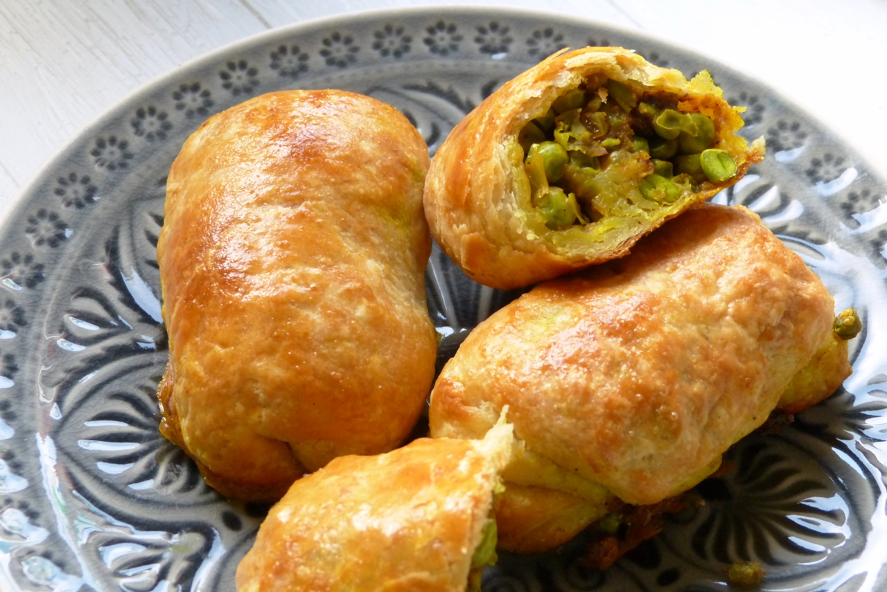 Pastizi sind kleine mit Erbsen gefüllte Blätterteigtaschen. Die Füllung wird mit Curry gewürzt; das hat uns geschmeckt. Sabrina Ghayour verwendet Erbsen aus der Dose – Kapuzinererbsen sollen es sein. Da wäre es nähere Erklärung nett gewesen; ich habe statt dessen eben Tiefkühlerbsen verarbeitet.