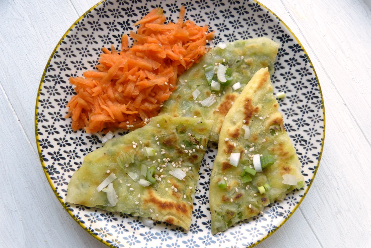 Pfannkuchen mit Frühlingszwiebeln und Sesam bestreuen und zusammen mit dem Karottensalat servieren.