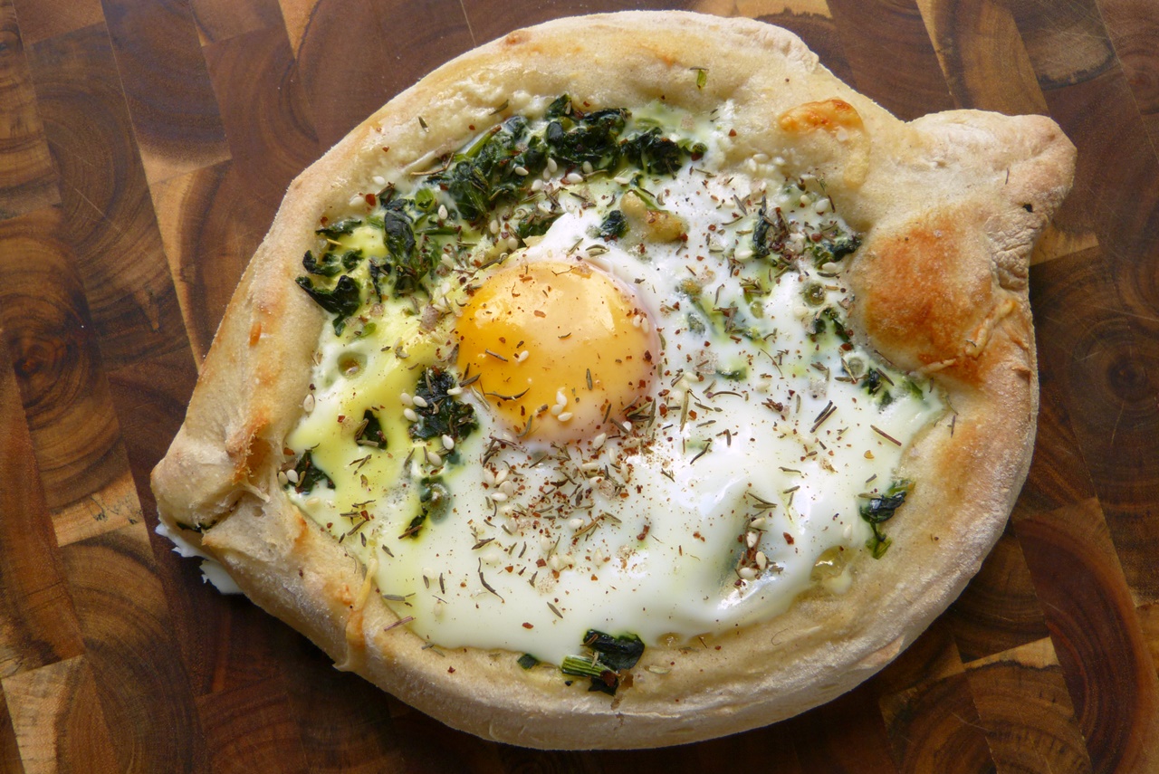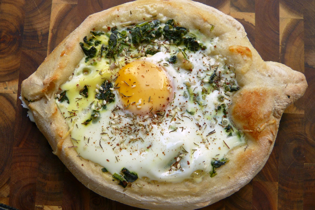Chatchapuri ist ein georgischer Klassiker. Eigentlich spielt beim Belag Käse die Hauptrolle, und irgendwann stelle ich Euch auch noch die klassische Version vor. Aber erst einmal gibt diese Variante, die Molly Yeh* als die „beste Frühstückspizza“ bezeichnet. Wir hatten das Ganze aber trotzdem zum Abendessen ;-).