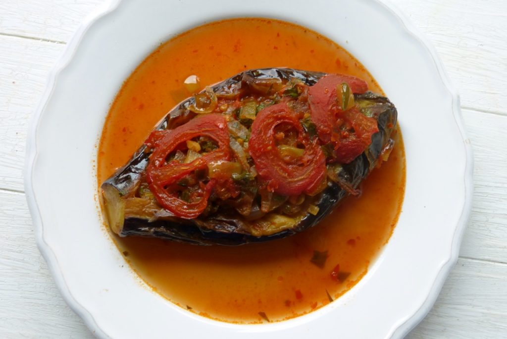 Das ist mein absolutes Hochsommer-Lieblingsgericht. Imam Bayıldı , das heißt „Der Imam fiel in Ohnmacht“, und zwar tat er dies vor Entzücken über dieses köstliche Gericht. Andere sagen, er ist umgekippt, weil er zu viel davon gegessen hat. Und ich kann den Imam gut verstehen.