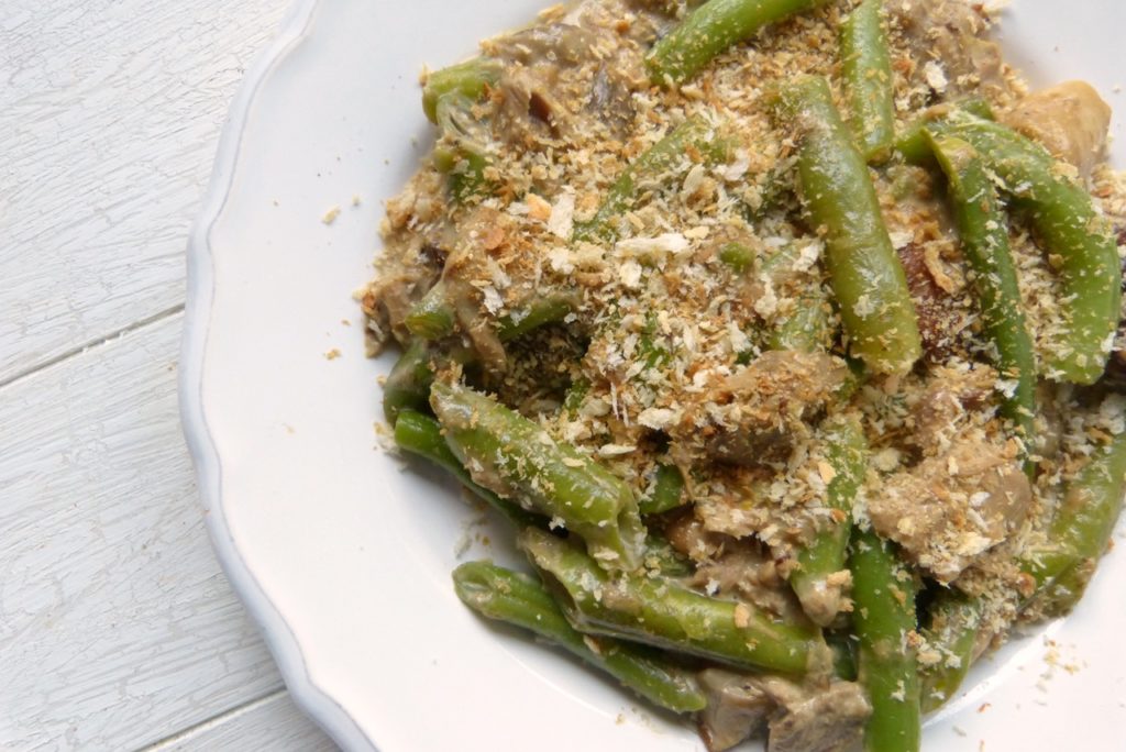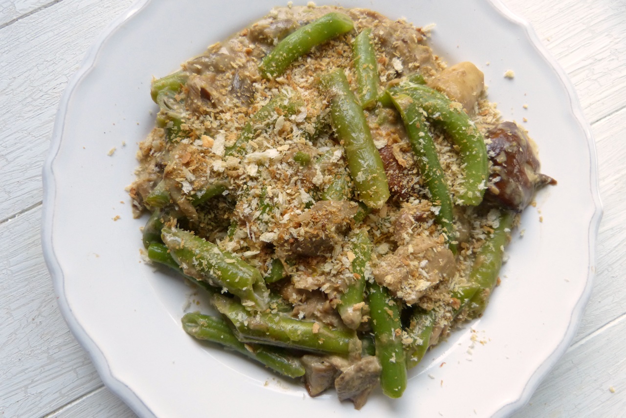 Aber was soll’s – das Ganze schmeckt wunderbar. Es ist eine Mischung aus Bohnen und Pilzen, die gegart und in einer Sauce aus Thunfisch und Sahne serviert werden. Eine schöne Portion Gemüse in einer cremigen Sauce. Das Gericht geht zurück auf ein Lieblingsessen aus Joshua McFaddens Kindertagen: damals gab es zu Thanksgiving einen Auflauf aus grünen Bohnen und Pilzen; allerdings nicht mit frischen Pilzen, sondern mit einer seinerzeit in den USA sehr beliebten Pilz-Dosensuppe. Dosensuppe kommt Joshua McFadden heute nicht mehr auf den Tisch – er nennt dieses Gericht die „erwachsene Version“ des Leibgerichts aus Kindertagen.
