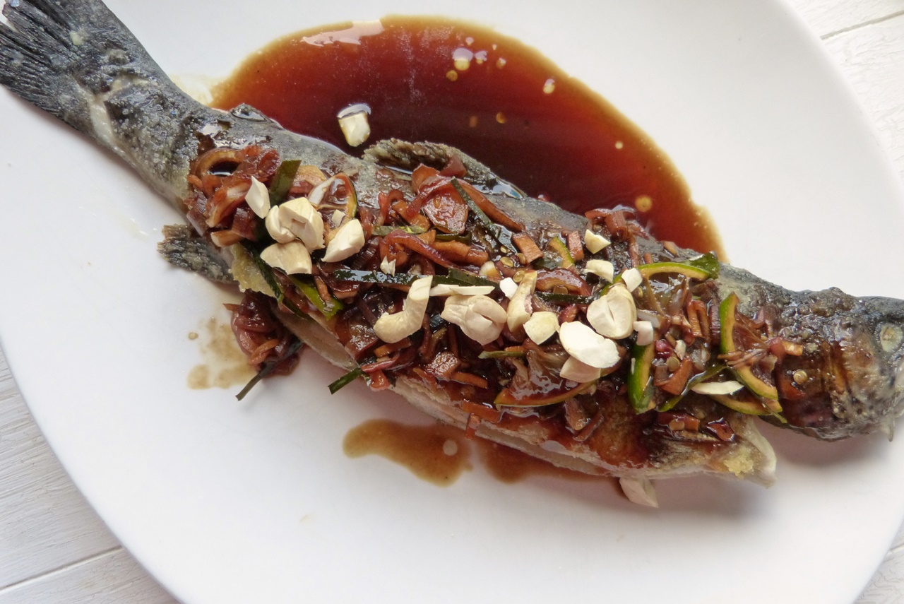 „Forelle asiatisch“, so heißt das ganz lapidar im Buch. Da sind es Forellenfilets, gewälzt in Tapiocamehl und frittiert und mit einem Topping aus karamellisiertem Palmzucker, Fischsauce, Tamarinde, Schalotte, Limette, Chili, Knoblauch, Zitronengras und Makrutblättern. Nur so viel – das Topping ist ein Geniestreich. Die festen Zutaten werden ganz fein geschnitten, ziehen in der Sauce und schmecken am Ende zum Niederknien. Bei der Forelle war ich überambitioniert ;-). Im Rezept werden Filets verwendet. Auf dem Foto aber sieht man eine Forelle im Ganzen, die dekorativ im Schmetterlingsschnitt aufgeschnitten ist. Kann ich auch, dachte ich. Nun, konnte ich nicht – daher habe ich die Forellen im Ganzen gebraten….