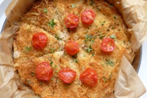 Kadaifi sind ganz feine frische Fadennudeln, auch Engelshaar genannt. Meist wird aus ihnen zusammen mit Nüssen und einer ansehnlichen Menge Zuckersirup ein Dessert. Hier aber gibt es ein Rezept für eine herzhafte Variante – und das ist ein Hammer. Die Nudelfäden werden mit Mascarpone, Ziegenfrischkäse, Sahne und Za’atar geschichtet und gebacken; dazu gesellen sich geröstete Kirschtomaten. Zugegebenermassen kein Diätessen – aber der Hammer. Wir haben gefuttert, als gäbe es kein Morgen.