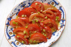 Die asiatische Tahina ist ein Salatdressig, basierend auf Tahin und Traubenkernöl, gewürzt mit Ingwer, Knoblauch, Sojasauce, Reisessig und Mirin. Eigentlich kommt es über geröstete Auberginen; ich habe statt dessen Haya Molchos zusätzlichen Küchentipp verwirklicht: das Dressing passt nämlich auch hervorragend über einen Tomatensalat.