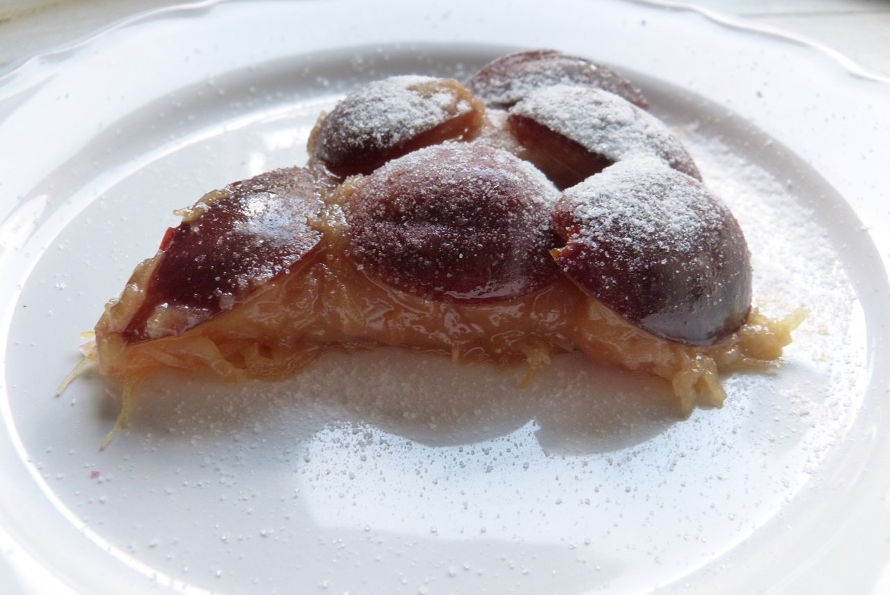 Von dem herzhaften Auflauf war noch genau die passende Menge Kadayfi für etwas Süßes übrig: für die Pflaumen-Tarte Tatin werden halbierte Pflaumen in einer Karamellsauce in die Backform geben, darüber kommen als Boden die Teigfäden. Ein toller Nachtisch, auch wenn ich mich beim Aus-der-Form-Stürzen etwas doof angestellt habe.