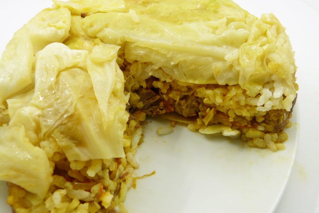 Maqluba, das ist für mich ein richtiges Leibgericht. Es ist ein Reisgericht, wie es in Palästina gerne gegessen wird: vorgegarter Reis wird mit Gemüse und Fleisch in einen Topf geschichtet, dann wird alles zusammen gegart und am Ende hat man einen mehrschichtigen Reiskuchen, der auf eine Servierplatte gestürzt wird. Daher auch der Name – Maqluba bedeutet “ auf den Kopf gestellt“. Die Urversion ist verwendet Hähnchen und Blumenkohl; hier gesellt sich außerdem noch Aubergine dazu (das Foto braucht ein Update; ich muss diese Version mal wieder machen). Klassischerweise wird außerdem Basmati-Reis verwendet.