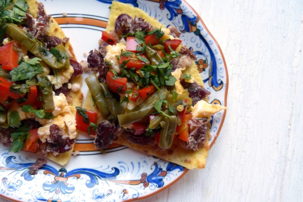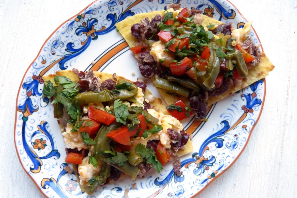 Und dann geht es ans Zusammenbauen. Meine Tortillas waren etwas groß, ich habe sie deshalb geviertelt. Kleine kann man auch gut ganz lassen. Jede Tortilla mit etwas Bohnenmasse bestreichen, dann etwas Ei darauf verteilen und schließlich großzügig Nopales-Masse darüber geben. Mit zusätzlichem Koriander bestreuen und gleich servieren.