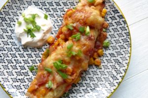 Eintopf hatte ich zwar nicht übrig, aber einen Rest Bolognese. Und irgendwo im Vorratsschrank sind ja immer Bohnen, die habe ich gekocht und unter die restliche Bolognese geschmuggelt. Zusammen mit einer Tomatensauce mit Mais, Tortillas und Käse wurden daraus Eintopf-Enchiladas. Die sind so empfehlenswert – ich würde sagen, kocht etwas Eintopf zu viel, damit Ihr die machen könnt.