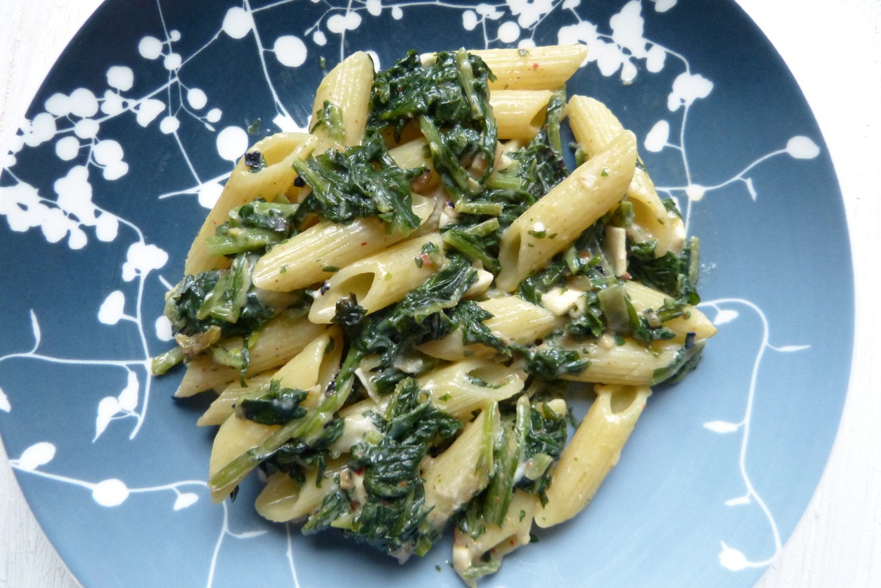 Ich möchte an dieser Stelle nicht näher darauf eingehen, warum, aber ich hatte tatsächlich eine Handvoll blanchierten Löwenzahn im Tiefkühler. Das Buch schlägt vor: Pasta mit Grünzeug und Ziegenkäse.
