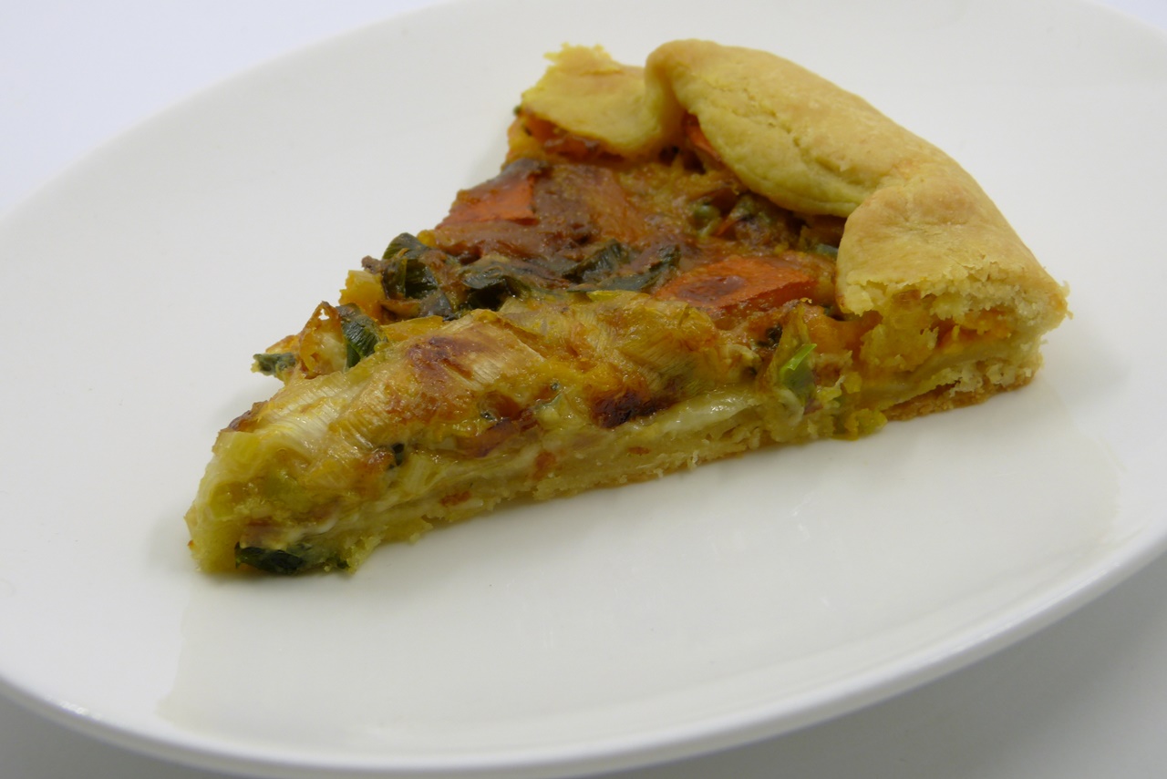 Ein Vorschlag für die Verwendung von Resten gegarter Zutaten, ist es, daraus Pies, Pasteten oder Teigtaschen zu machen. Da gibt es ein Basisrezept für salzigen Mürbteig und Ideen für Füllungen. Kürbis und Käse ist einer davon. Ich hatte noch etwas gerösteten Hokkaido; den habe ich mit Blauschimmelkäse und Crème fraîche kombiniert. Eine halbe Stange Lauch lungerte auch noch im Gemüsefach herum, die habe ich gebraten und ebenfalls in die Füllung geschmuggelt.