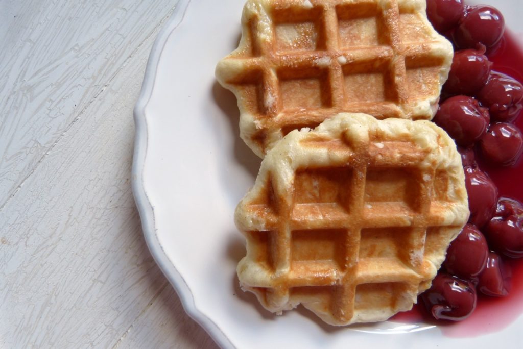 Serviert werden die Waffeln mit Kirschkompott; original sind Süßkirschen. Die Kirschzeit war vorbei, als ich die Waffeln gebacken habe; ich habe daher Schattenmorellen aus dem Glas verwendet.