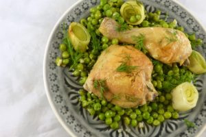 Dieses geniale Hühnchengericht mit Lauch und Erbsen mit einem ganz besonderen Kniff zum Beispiel.