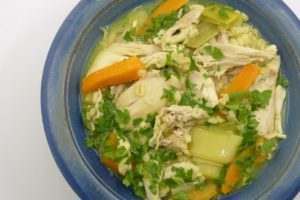 Hähncheneintopf mit Graupen – sehr einfach, und dabei ein richtiges Wohlfühlessen: Graupen, eine Menge Gemüse und gehäutete Hühnerschenkel garen in einer senfwürzigen Hühnerbrühe.