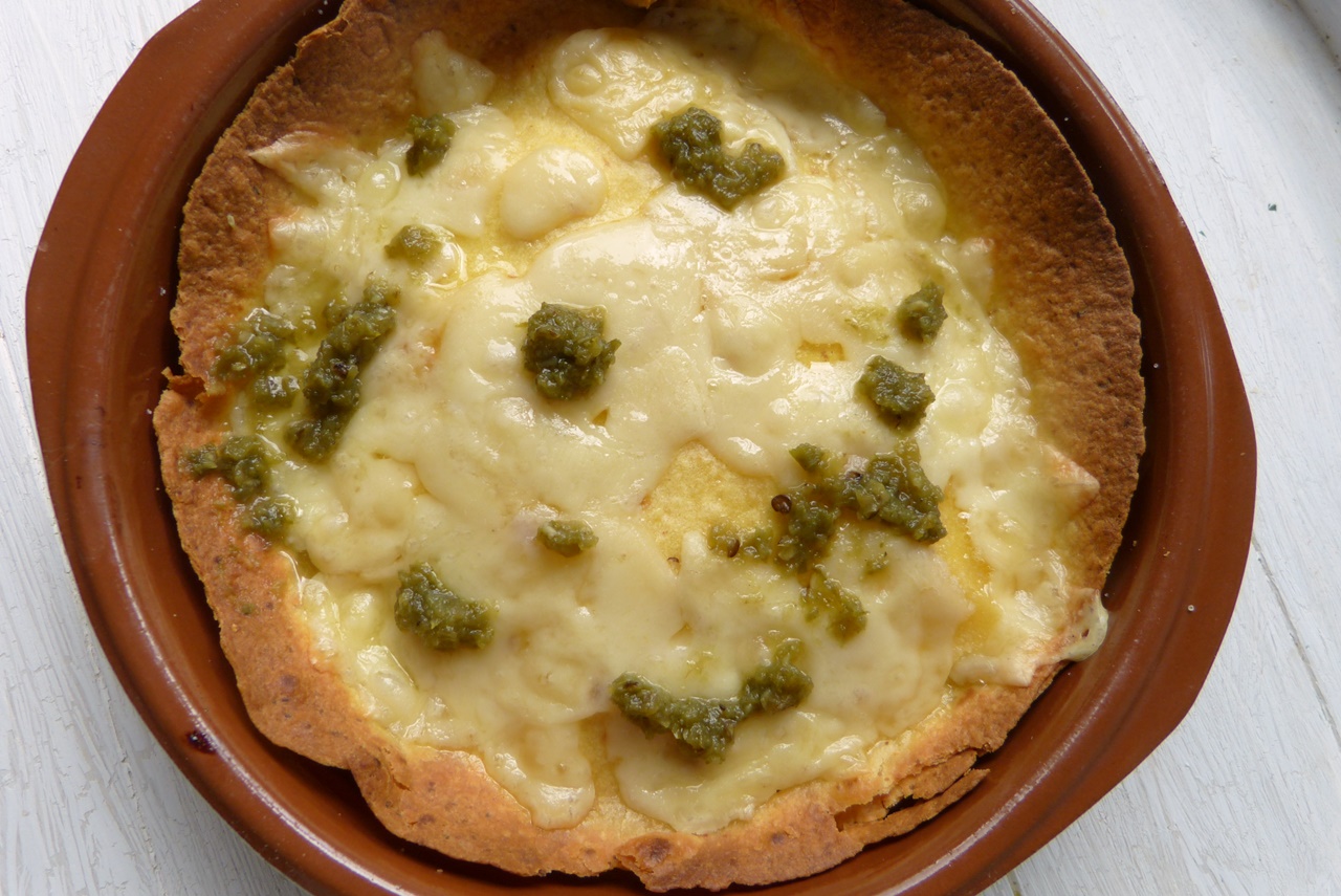 Tortilla Pie – ebenso simpel wie gut: eine Tortilla auf den Boden einer passenden Form, darauf Schinken, Käse und zwei Eier, ein Deckel aus einer zweiten Tortilla, mehr Käse. Aus dem Ofen zieht man dann eine kleine Pie für 2 Personen mit geschmolzenem Käse und perfekt gegarten Spiegeleiern.