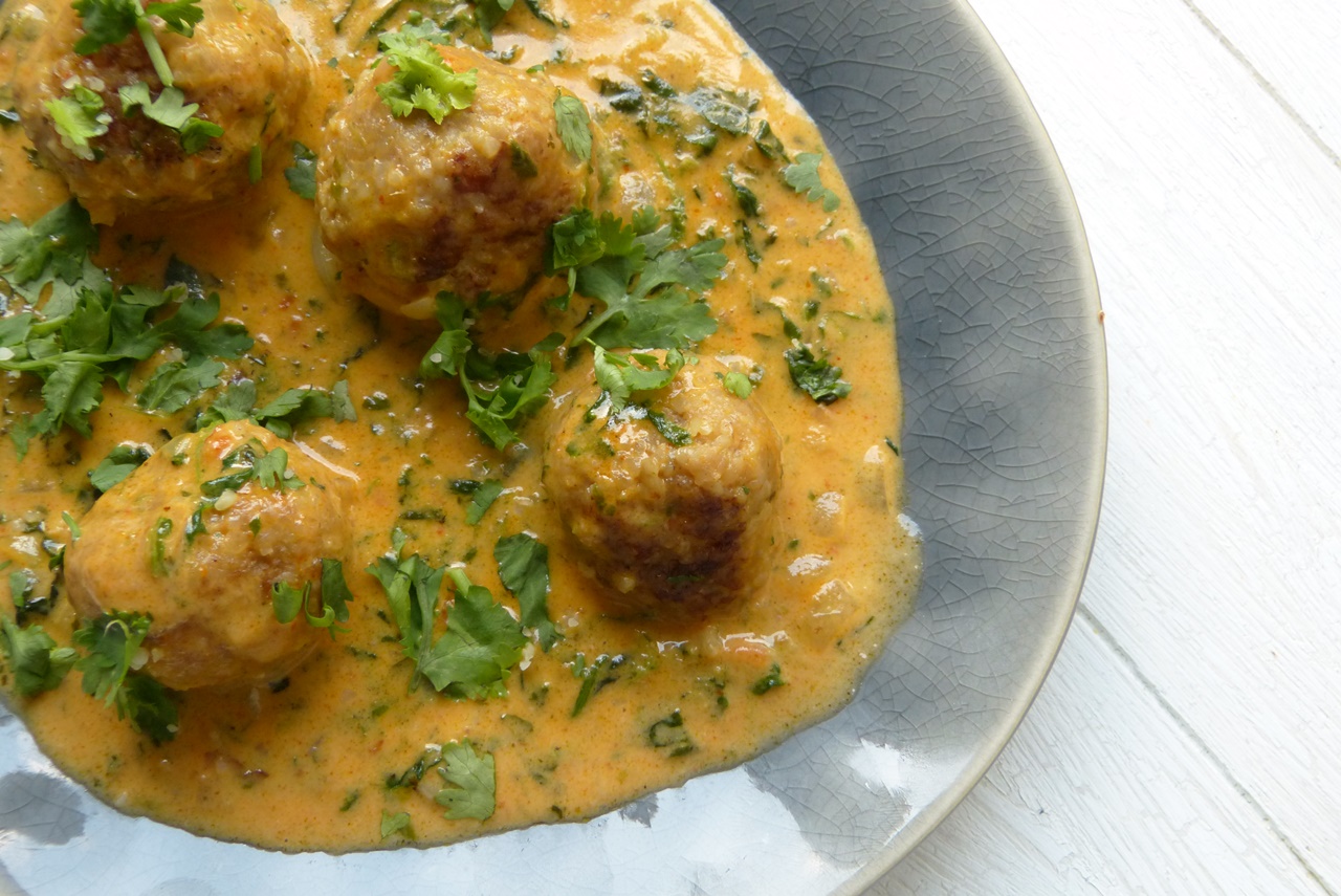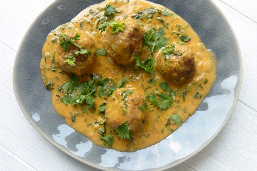 Dass das toll schmeckt, liegt zum einen an der Sauce – die Kokos-Curry-Kombination ist mild und cremig. Aber auch an den Bällchen, die haben nämlich einen gewissen Twist: Außer Fleisch ist eingeweichter Bulgur darin, und die Fleischmasse wird nicht nur verknetet, sondern gemixt. Das sorgt für eine unnachahmlich zarte Konsistenz.