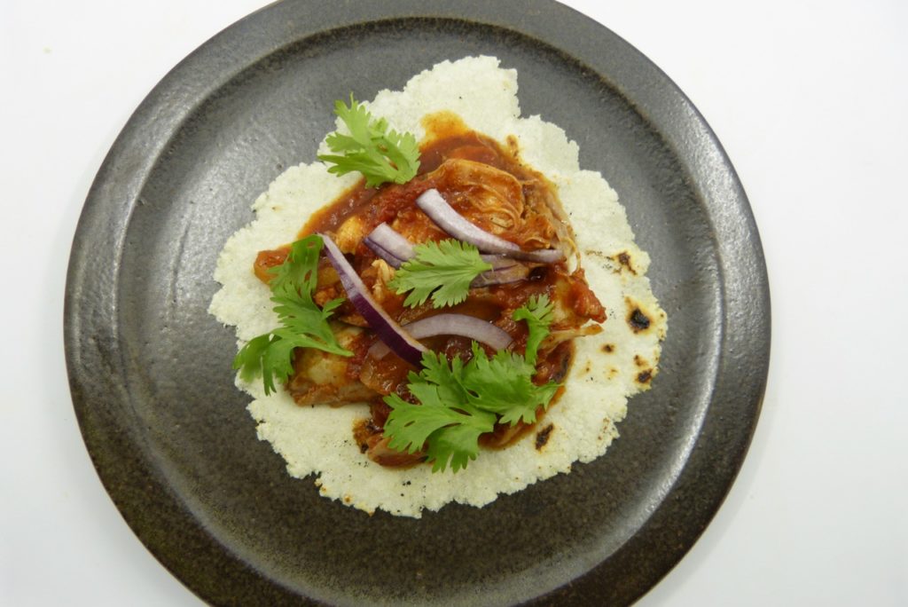 Zum Servieren die Tortillas mit etwas Hühnerragout, einigen Zwiebelringen und Koriandergrün füllen und gleich servieren.