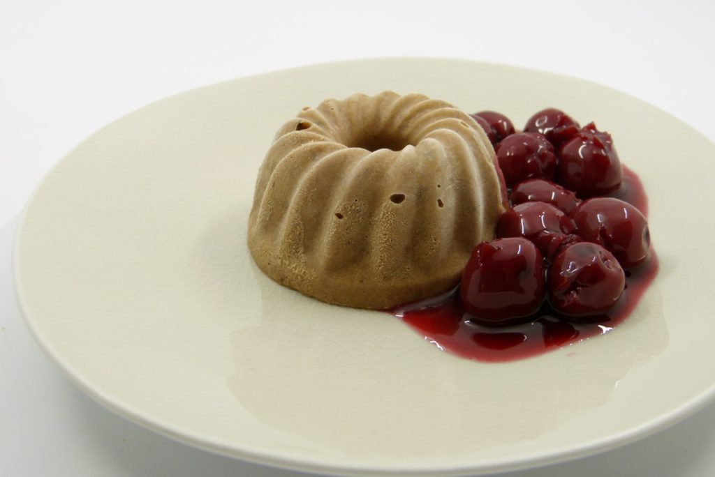 Zum Servieren das Eis aus den Förmchen lösen und mit der Kirschsauce anrichten. Idealerweise nimmt man das Eis ca. 10 min vor dem Servieren aus der Tiefkühle.