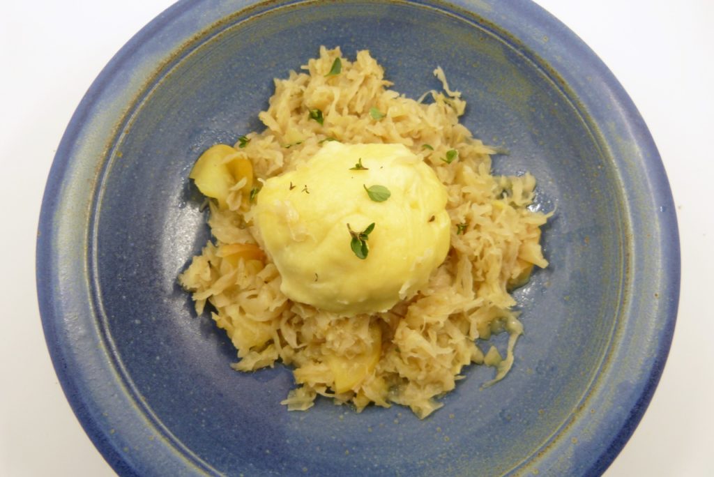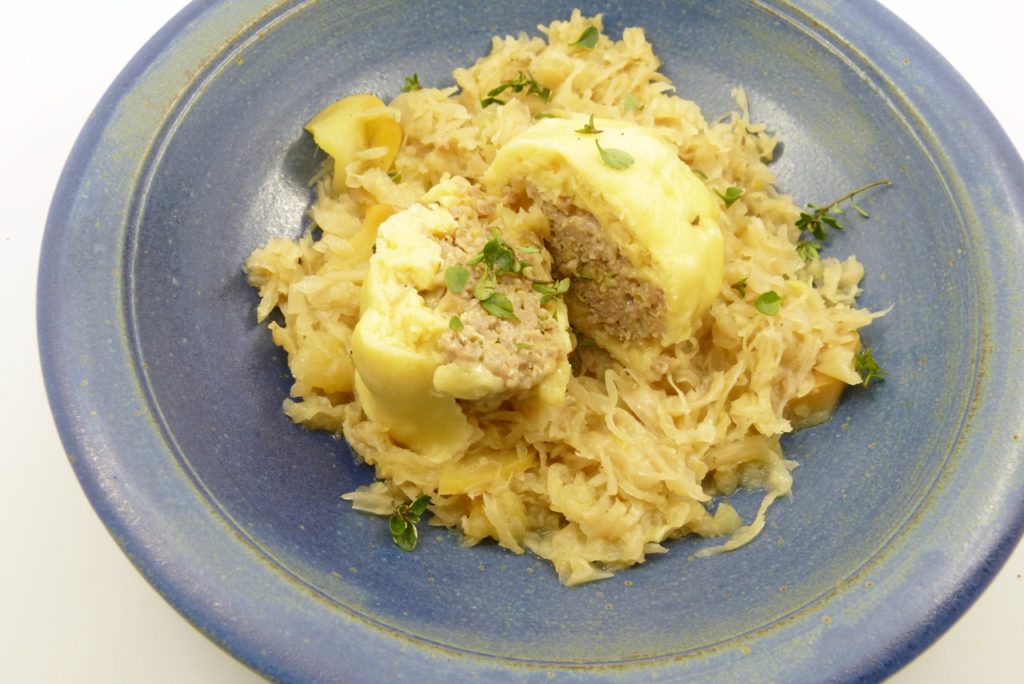 Wer kein Sauerkraut mag – ich könnte mir vorstellen, dass das auch mit geschmortem Rotkohl, Weißkohl oder Wirsing gut schmeckt.