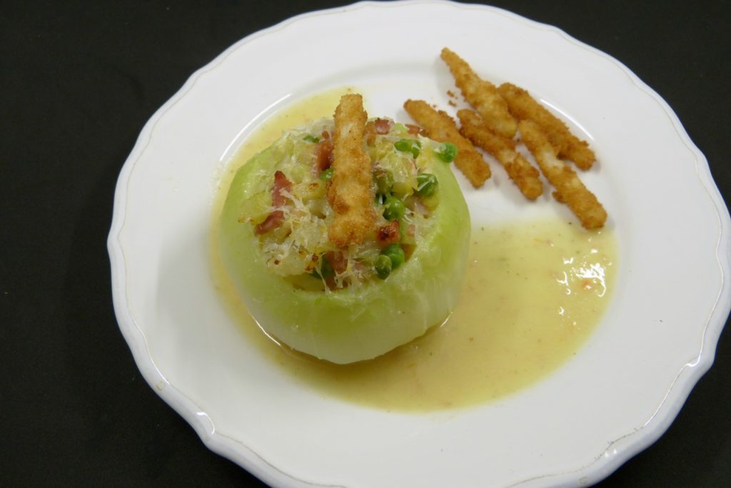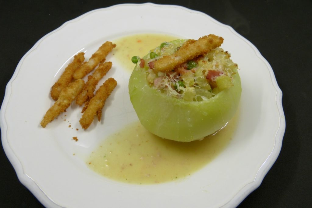Das Gericht hat schon ein paar Komponenten mehr, so etwas wie „Fünf Zutaten“ oder „30 Minuten“ kann man getrost vergessen. Es werden Kohlrabis ausgehöhlt, die Zutaten für die Füllung gegart, eine Sauce hergestellt und es gibt noch frittierte Kohlrabistäbchen auf den Teller. Blitzküche ist es nicht.