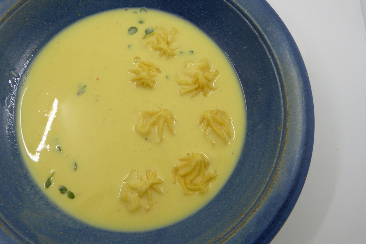 In der restlichen Butter die Schinkenabschnitte anbraten, mit Gemüsebrühe aufgießen, dann die zerdrückte Kartoffel zugeben und alles erwärmen. Mit dem Stabmixer aufmixen,bis die Sauce bindet, dann mit der Nussbutter verfeinern.