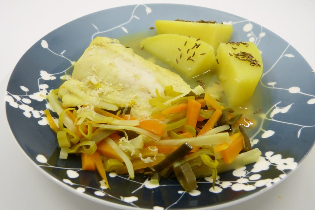 Der Fisch wird in einen säuerlichen Sud aus Fischfond, Weisswein und Essig pochiert und ist zart und saftig, der Sud schmeckt herrlich. Das Gemüse gart gleich mit in der Pochierflüssigkeit. Mich hat diese Zubereitung sehr an das Steirische Wurzelfleisch erinnert, dass ich schon seit langer Zeit mal kochen wollte – gut, habe ich eben mit Fisch angefangen, das Fleisch kommt später…