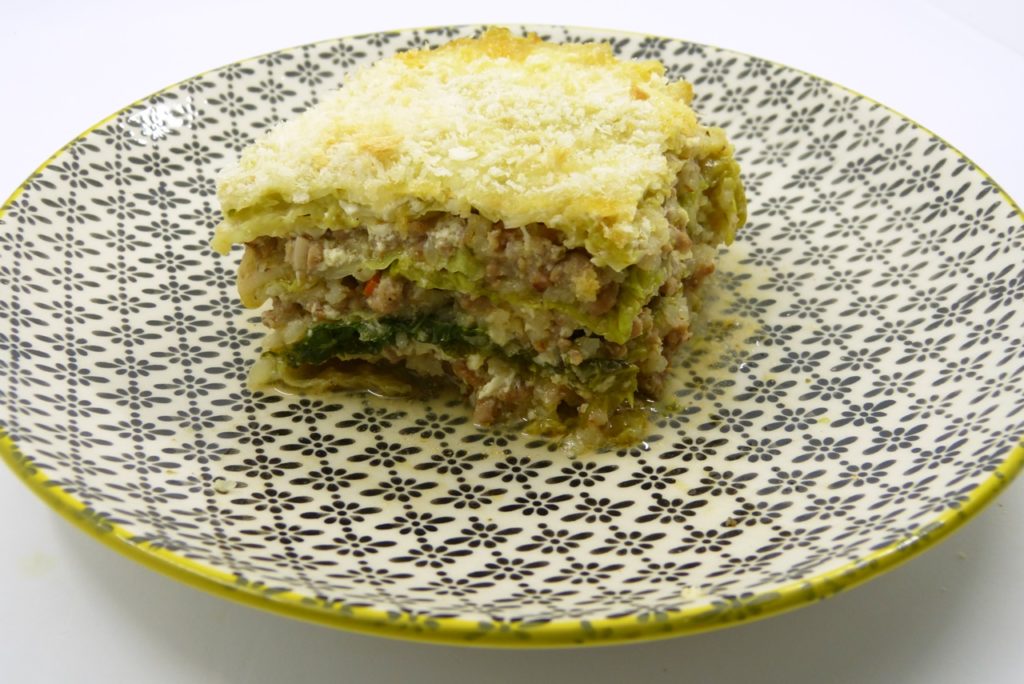 Also Wirsing-Lasagne. Und die ist toll; probiert die aus, so lange Wirsing noch Saison hat: blanchierte Wirsingblätter werden geschichtet mit Lammhack und Reis; es gibt keine Bechamelsauce, sondern statt dessen Sauerrahm. Ich bin vom Original* etwas abgewichen und habe auch etwas Joghurt benutzt, der Auflauf ist auch so noch üppig genug; ein richtiges Wintergericht.