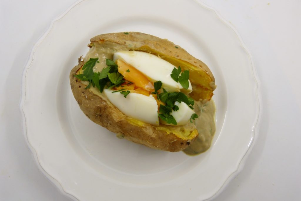 Klar mit einer ordentlichen Thunfisch-Sosse schmeckt jede Ofenkartoffel. Geht aber auch mit Quark oder Ziegenfrischkäse.